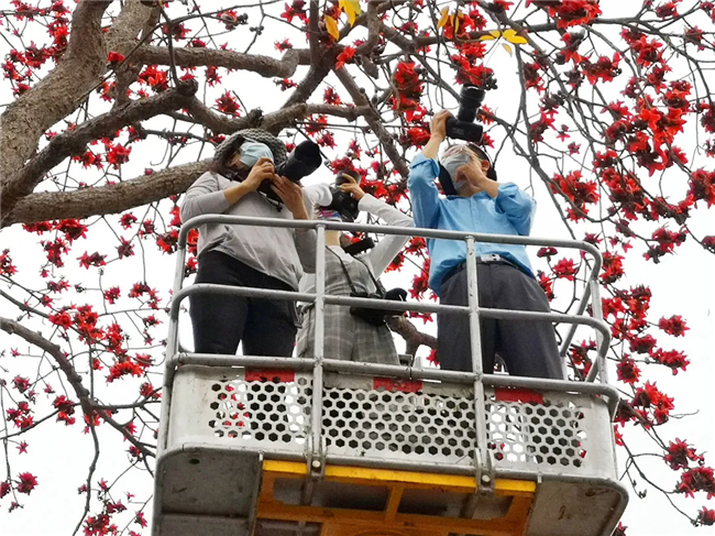 原來,是攝影愛好者為了拍下美美的木棉花,租下了高空作業(yè)車,與閱江樓門前怒放的紅棉來個“近距離接觸”。