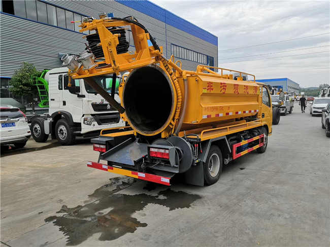 東風多利卡6方清洗吸污車,國五多利卡清洗吸污車:采用玉柴115馬力發動機,5檔變速箱,7.00鋼絲胎。罐體總容積6方,污水罐4方,清水罐2方,配備SK—9水循環泵,170流量高壓泵,罐體舉升后蓋液壓開啟。