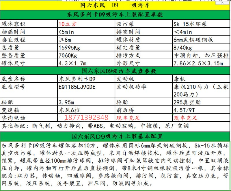 東風(fēng)D9吸污車/國六10方吸污車:整車配置基本參數(shù)如下