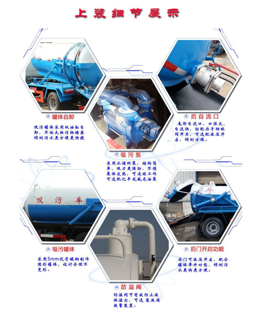 10方東風(fēng)多利卡D9吸污車上裝罐體采用Q235國標(biāo)6mm優(yōu)質(zhì)碳鋼鋼材制作,配置水循環(huán)泵,泵可自吸自排,真空度高,吸程遠(yuǎn);安裝防溢閥網(wǎng)裝置,預(yù)防抽滿罐了,防溢閥后面的濾網(wǎng)可以再過濾一次,相當(dāng)于起到二次保護(hù);一個防溢閥,加粗型視糞亮管,罐體可液壓舉升自卸,后蓋可液壓打開,一個自流口,一根8米的吸污管。